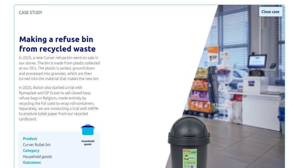In 2025, Action also started a trial with Rymoplast and GP Groot to sell closed-loop refuse bags in Belgium, made entirely by recycling the foil used to wrap roll-containers. Separately, we are conducting a trial with WEPA to produce toilet paper from our recycled cardboard.
