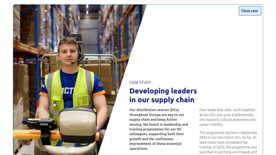 Our distribution centres (DCs) throughout Europe are key to our supply chain and keep Action moving. We invest in leadership and training programmes for our DC colleagues, supporting both their growth and the continuous improvement of these essential operations.