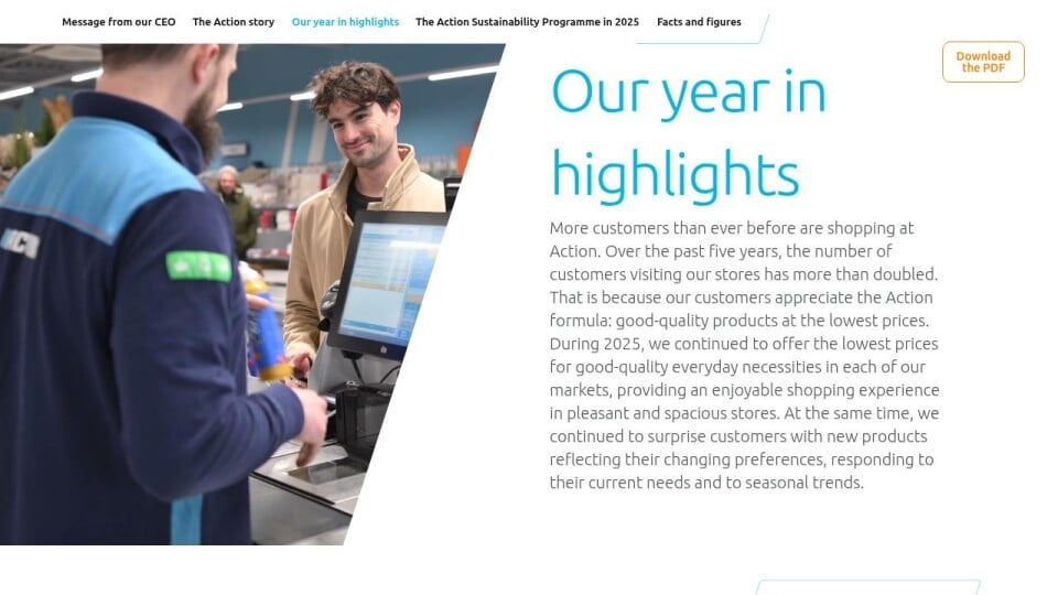 More customers than ever before are shopping at Action. Over the past five years, the number of customers visiting our stores has more than doubled. That is because our customers appreciate the Action formula: good-quality products at the lowest prices. During 2025, we continued to offer the lowest prices for good-quality everyday necessities in each of our markets, providing an enjoyable shopping experience in pleasant and spacious stores. At the same time, we continued to surprise customers with new products reflecting their changing preferences, responding to their current needs and to seasonal trends.